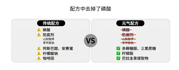 去掉了传统可乐配方中的磷酸,就是直指传统可乐饮料中磷酸盐的危害。因为医学表明,过量摄入磷酸盐会威胁人体骨骼和心脑血管,譬如龋齿。用巴拉圭茶提取物取代了可乐中的人工咖啡因,则再次callback传统可乐有成瘾性的潜在威胁。