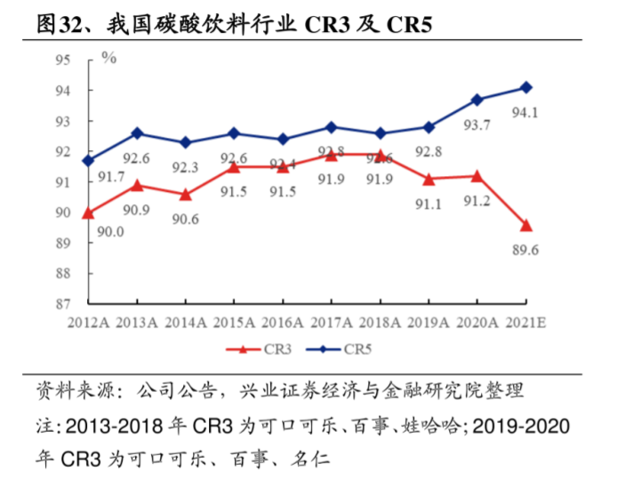 将视线拉回国内,2020年,我国碳酸饮料行业CR3(业务规模TOP3公司所占的市场份额)达到了91.2%,而茶饮料和功能饮料的行业CR3分别为57%、46.5%。足见行业集中度之高。