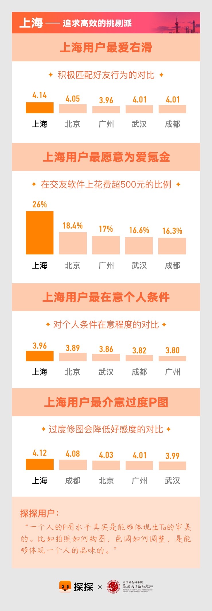 探探的“左滑右滑、互相喜欢才能聊天”的核心产品机制,给用户带来了有趣、浪漫的独特体验。报告显示,上海用户在使用交友软件时最爱 “右滑”结交新朋友。同时,上海用户对于交友技术和平台的信任程度以及对交友平台所匹配到的约会对象的满意程度都是最高的。正是因为如此,上海用户对于“氪金”同样持开放心态。26%的上海用户在交友软件上花费超过500元,比例远超其他城市,10.3%的上海女性甚至花费超千元。