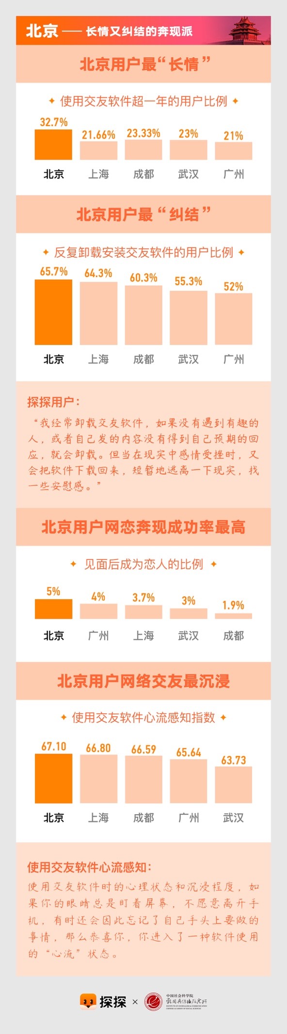 有趣的是,北京不算是最爱线下见面的城市,但是北京却是所有城市中网恋“奔现”成功率最高的城市,有5%的北京受访用户和在交友软件认识的网友线下见面之后,成功发展成为恋人关系。旨在帮助用户“脱单”的探探,已经成为单身男女寻找未来伴侣的重要途径。