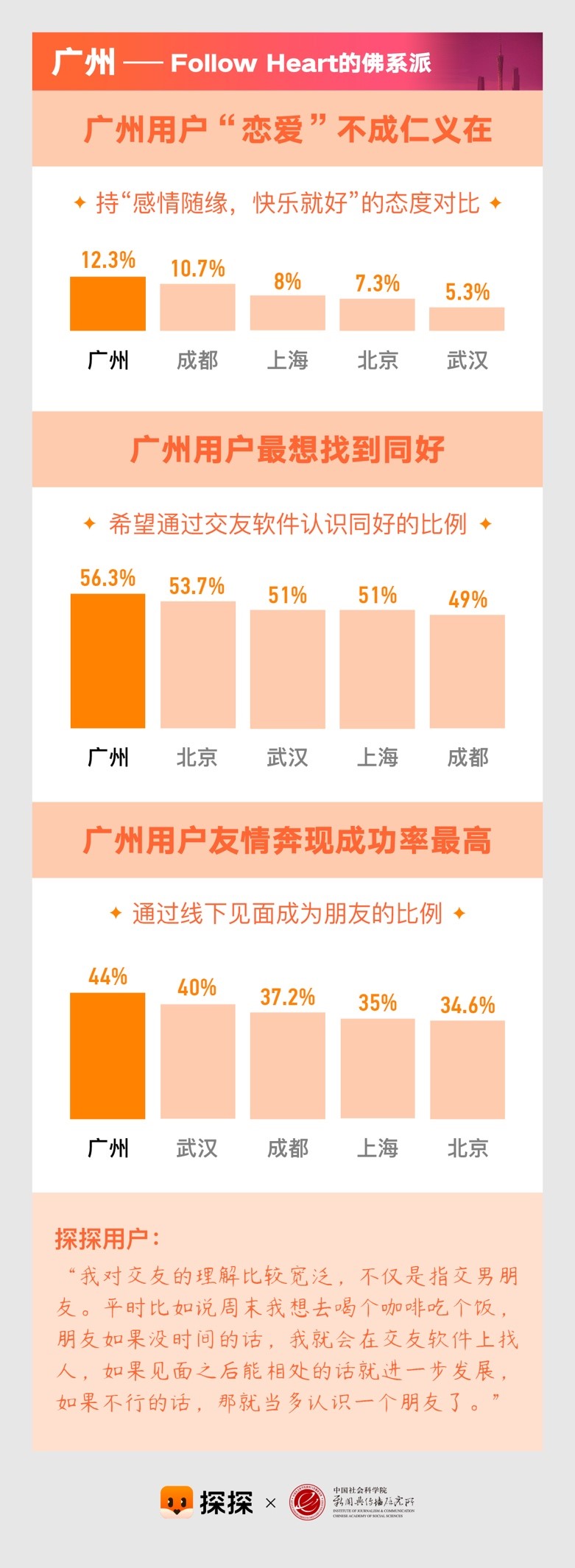 探探根据用户的个人资料、位置、兴趣爱好等信息,为用户推送身边与其匹配的人,帮助用户结识互有好感的新朋友 。但是并非所有的用户都可以在这里找到合适的伴侣,“做不成恋人还能做朋友”是很多广州用户的选择。56.3%的广州用户希望通过交友软件认识同好,这一比例远高于其他城市。一位广州用户在受访时表示:“我对交友的理解比较宽泛,不仅是指交男朋友。平时比如说周末我想去喝个咖啡吃个饭,朋友如果没时间的话,我就会在交友软件上找人,如果见面之后能相处的话就进一步发展,如果不行的话,那就当多认识一个朋友了。”