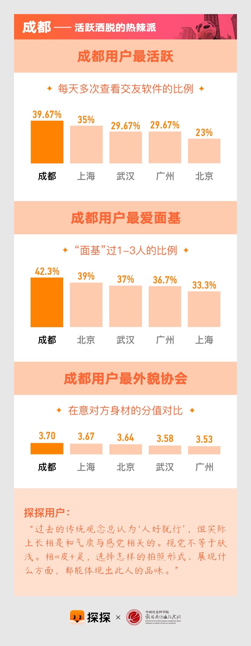 与其他城市相比,成都用户可谓是“外貌协会”资深会员,在匹配聊天对象时,选择“更在意对方身材”的平均分值最高。一位成都探探用户表示,过去的传统观念总认为“人好就行”,但实际上长相是和气质与感觉相关的。视觉不等于肤浅。相=皮+灵,选择怎样的拍照形式、展现什么方面,都能体现出此人的品味。