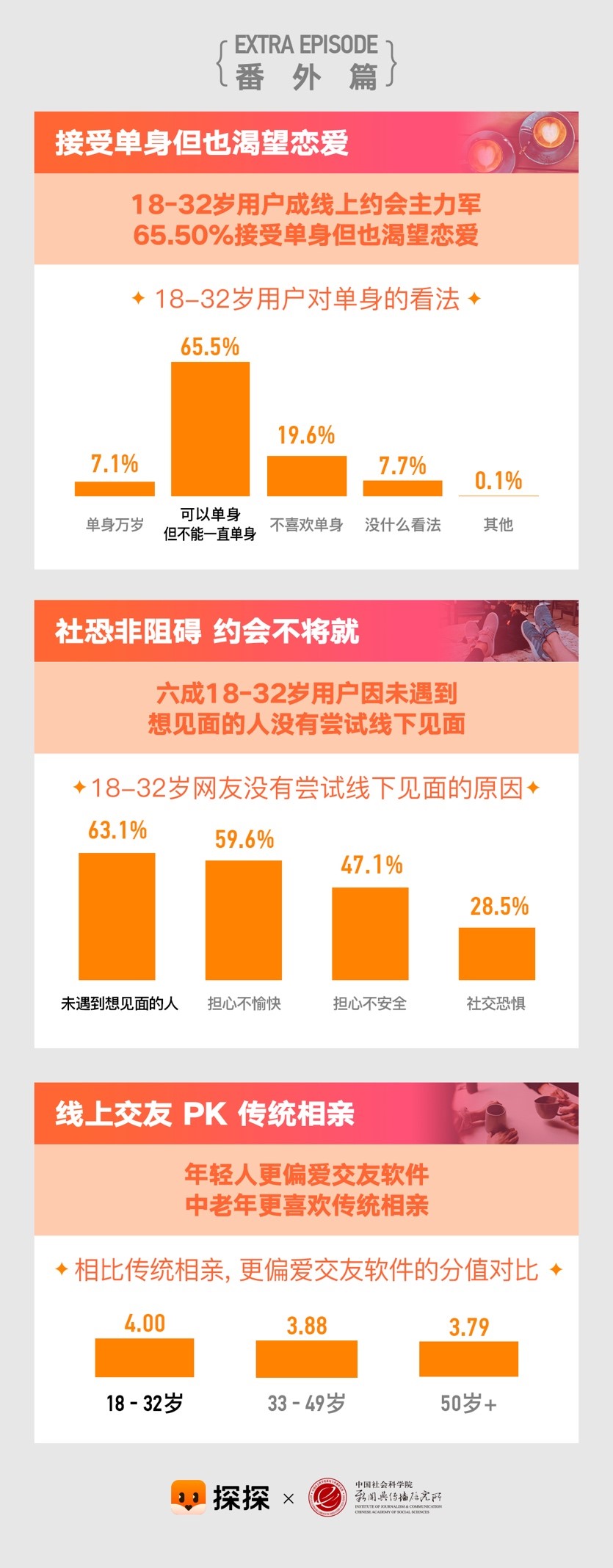 探探相关负责人介绍,本次调研以上海、广州、北京、武汉和成都五座城市为例,对城市中交友软件用户的使用习惯、社交体验、信任关系、心流感知和技术支持进行了深度调查和访谈,并向探探不同年龄、地域、教育背景的用户发放了调查问卷。报告显示,5%的北京用户与网友见面后成为恋人,26%的上海用户在交友软件上的花费超过500元,44%的广州用户与网友线下见面后成为了朋友。18-32岁用户是线上约会主力军,相比传统相亲,他们更偏爱通过交友软件寻找潜在婚恋对象。