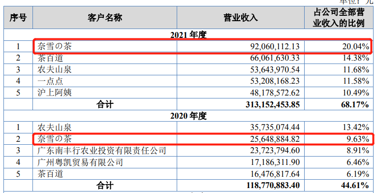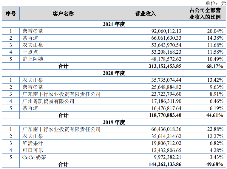 在新茶饮品牌出现之前,田野股份的大客户以传统的预包装饮料为主。2019年,田野股份前五大客户中便有农夫山泉和可口可乐两大传统饮料巨头,奶茶仅有CoCo一家。