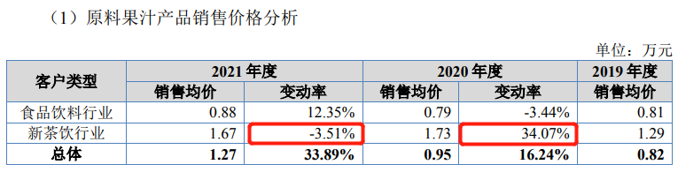 田野股份招股书显示,2021年田野股份对新茶饮行业的产品销售价格下降了3.51%,这一数字在2020年是上涨34.07%。换而言之,对于降价带来的利润降低,奈雪们选择压缩成本,将成本压力传导至供应端。