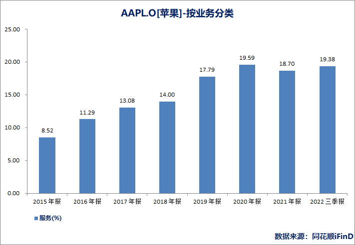 本季度,由于硬件业务出现了0.9%的同比下滑,苹果软件业务营收占比提升至23.63%。但从2022财年整体数据上看,苹果服务业务营收占比为19.38%,仍未超过20%。