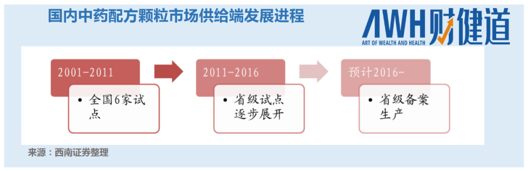 2001年,《中药配方颗粒管理暂行规定》正式出台,随后6家企业得到试点资格,(也就是俗称的“老6家”),2010年左右,二级以上的中医医院成为试点机构,2015年,国家放开单味配方颗粒的试点限制,2021年4月,国家药监局颁布第一批中药配方颗粒的国家药品标准,11月1日,经国家药监局等4部门发文明确结束中药配方颗粒试点工作。