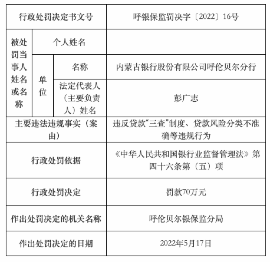 内蒙古银行呼伦贝尔分行被罚70万元:违反贷款“三查”制度、贷款风险分类不准确