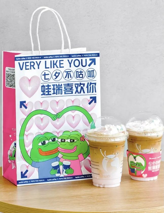 8月2日,瑞幸咖啡官宣与悲伤蛙联名推出七夕限定杯套和纸袋,新包装目前已上市。同时,瑞幸推出两款七夕特饮:百利甜莓拿铁、哇瑞草莓拿铁。
