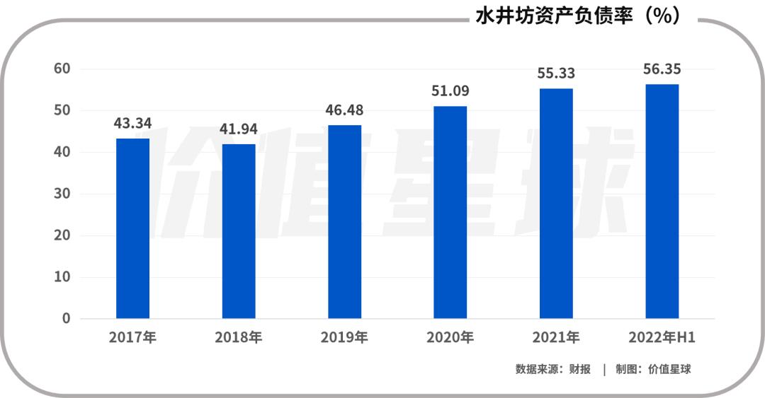 2021年年报时,价值星球就发现水井坊的资产负债率在走高,从2017年的43.34%增加到2021年底的55.33%。到了今年6月份,水井坊资产负债率进一步攀升至56.35%。