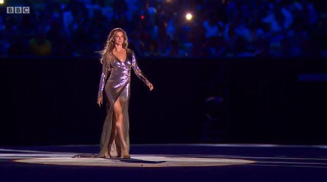 随着巴西名模吉塞尔·邦辰闪亮登场,开幕式的第一个气氛高潮到来,她穿着高叉长裙在球场上走秀,并向观众献出飞吻。之后是一组风格各异的歌曲串烧和令人目不暇接的舞蹈表演。1500多名演员涌向舞台,他们身穿各色服装,特色舞蹈令人目不暇接。全场演员摆动着身体,巴西人热情奔放地展现着自己的个性。
