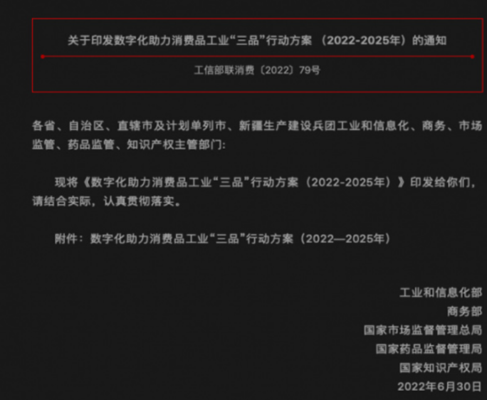 国货的兴起除了社会文化变迁、市场发展以及厂商自身的运作,也有政策利好的加持,政策”东风“吹来,国潮经济正呈现繁荣之姿,未来政策环境也呈利好态势。2022年6月30日,工信部、商务部、国家市场监督管理总局、国家药品监督管理局、国家知识产权局印发《数字化助力消费品工业“三品”行动方案(2022-2025年)》(下称《行动方案》),五部委联合推进国朝品牌建设。