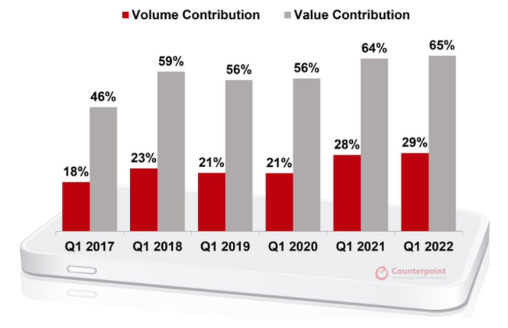 来自Counterpoint的数据显示,今年一季度全球中高端智能手机(售价400美元及以上)销量占比为29%,但销售价值占比达到65%。这两个数字,比2017年一季度分别提升了11%和21%。