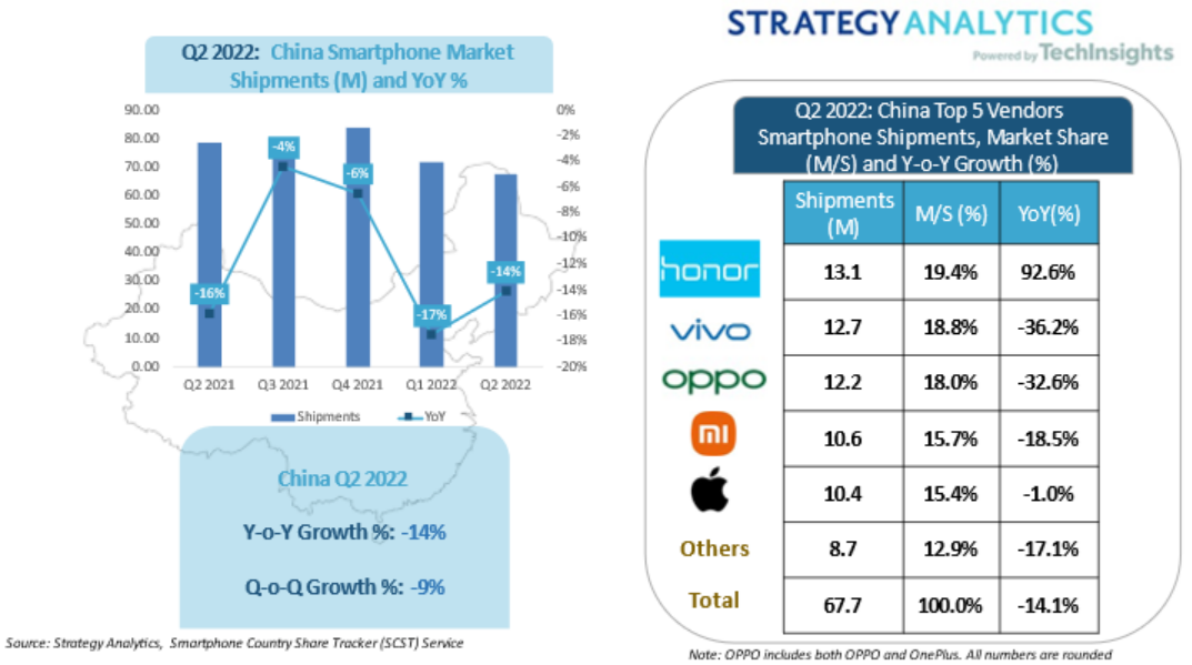 根据Strategy Analytics的报告,今年二季度荣耀以19%的市场份额力压18.8%的vivo和18%的OPPO,脱离华为独立后首次登顶。而在另一家知名数据机构IDC的报告中,荣耀的市场份额为19.5%,以0.4%的微弱优势压过vivo一头,同样登上了榜首宝座。