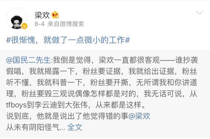 其后,梁欢在微博上与前来力挺偶像大张伟的粉丝展开了激辩。继而,他又晒出两者的视频对比片段,宣称大张伟完全抄袭了该国外DJ的编曲。8月4日,梁欢转发大张伟粉丝站其偶像的微博称:这事暂时到这里。中间也不乏力挺梁欢的网友,称他一直以来都很客观,对事不对人。