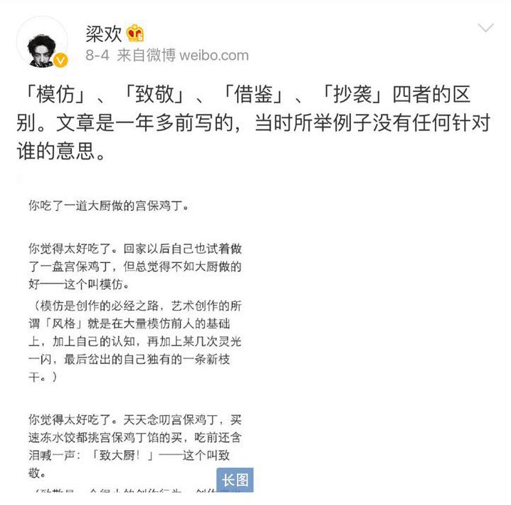 有网友扒出梁欢三年前写的文章指责其现在行为是打脸,梁欢也给出了回复。并发长文阐述了模仿、致敬、借鉴、抄袭的区别。