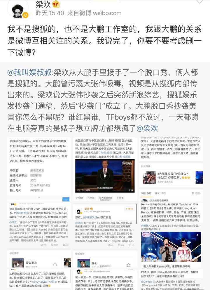 但也有“心思细腻”有网友甚至指出梁欢和大鹏是搜狐同门,大鹏曾污蔑大张伟吸毒。所以梁欢黑大张伟却不黑大鹏的脱口秀。梁欢回复与大鹏的关系只是微博互相关注,要求博主删帖。(此时事件已经跑偏,往阴谋论的方向去了。。)