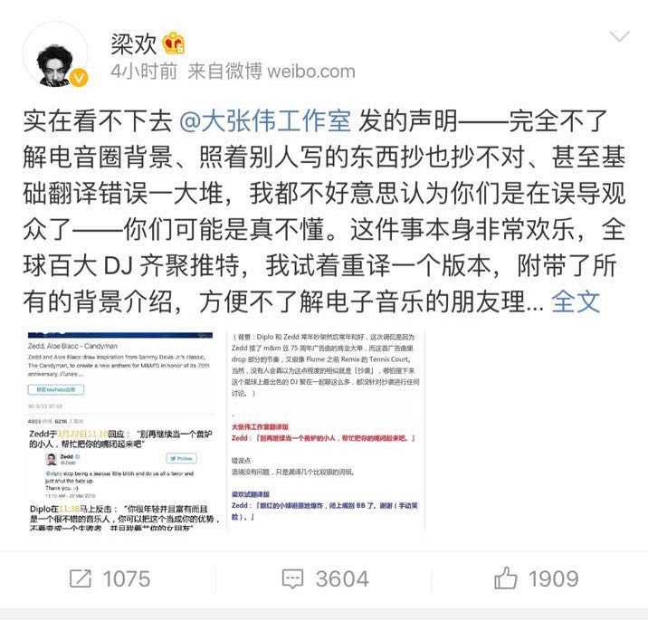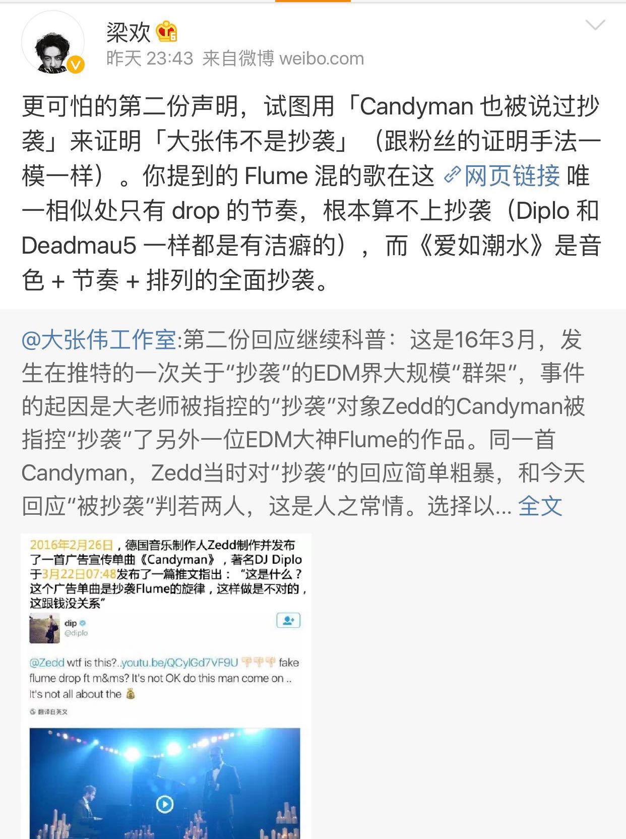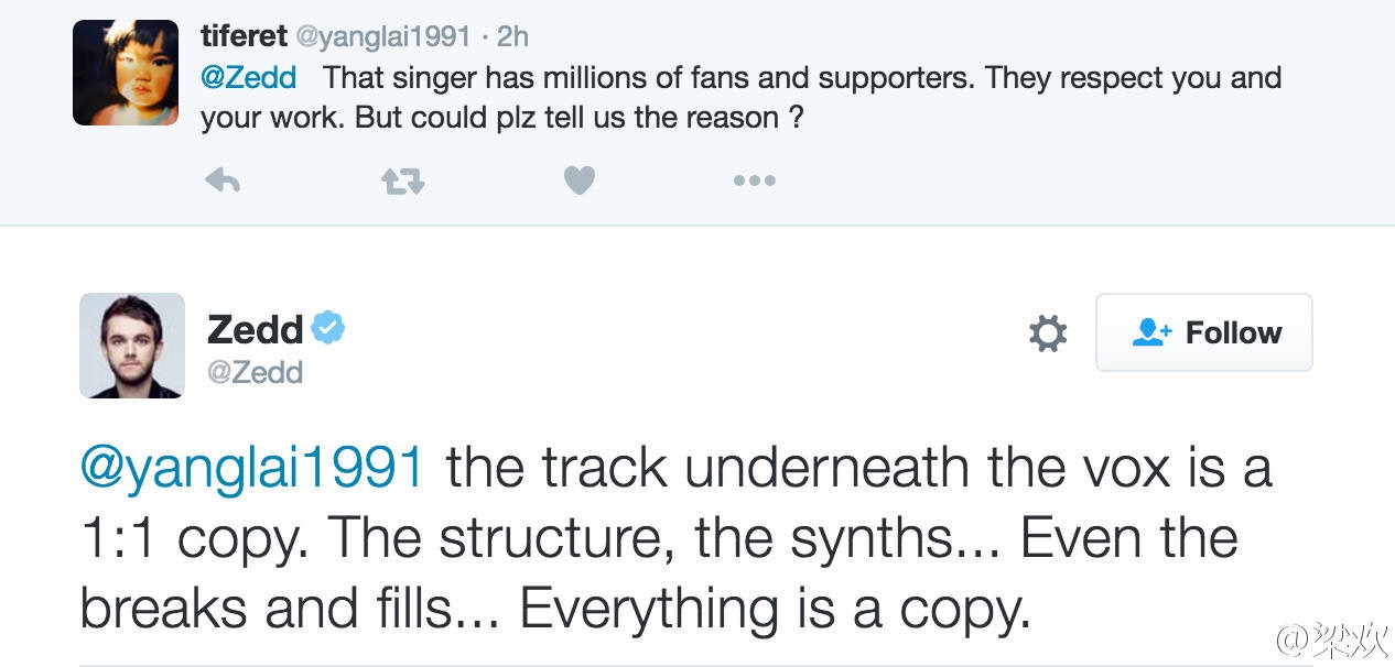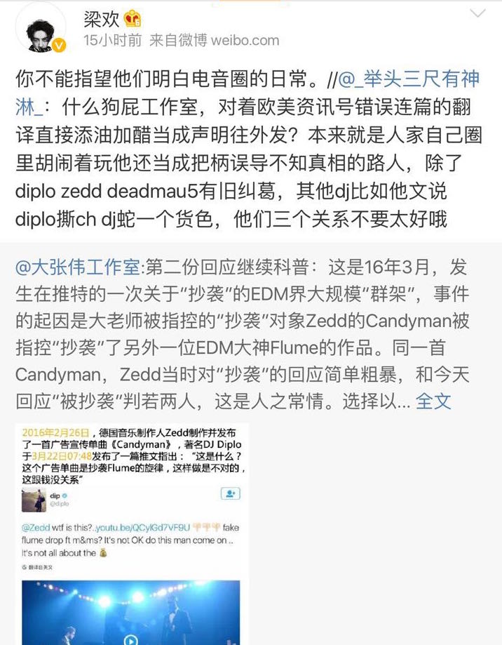 因为粉丝的看法大多是“不要那么认真,反正我喜欢大张伟”一类,梁欢搬来了原作歌手Zedd在推特上对于此事的看法,其回应称这是对自己歌曲的完全抄袭。