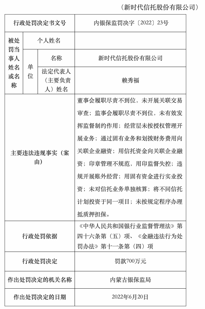 8月3日,内蒙古银保监局公布的行政处罚信息公开表显示,6月20日,新时代信托股份有限公司被内蒙古银保监局处以罚款700万元。主要违法违规事实为:董事会履职尽责不到位,未开展关联交易审查;监事会履职尽责不到位,未有效发挥监督制约作用;经营层未按授权管理开展业务;通过固有业务和划拨财务费用向关联企业融资;用信托资金向关联企业融资;印章管理不规范,用印监督失控;违规开展账外经营;用固有资金进行实业投资;未对信托业务单独核算;将不同信托计划投资于同一项目;未按规定程序办理抵质押担保。