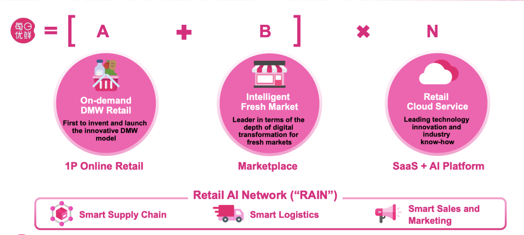 2019年每日优鲜宣布与腾讯零售合作,升级战略为(A+B)*N,对A(前置仓)补充广度 B(智慧菜场)和深度N(零售云)。