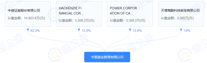 公开资料显示,华夏基金成立于1998年4月,目前中信证券(600030.SH)为公司第一大股东,持股比例为62.2%,第二大股东为两家外资股东,分别来自加拿大万信(Mackenzie Financial)与加拿大鲍尔公司,持股比例均为13.9%,天津海鹏科技咨询有限公司(下称“天津海鹏”)为第四大股东,持股10%。
