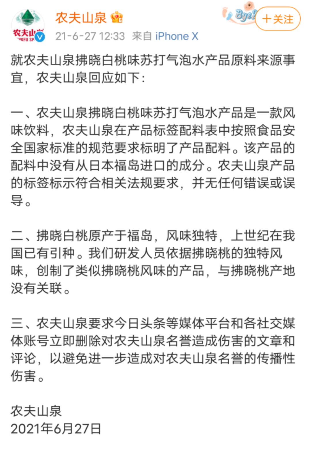 引发争议后,农夫山泉迅速回应称,“我们研发人员依据拂晓桃的独特风味,创制了类似拂晓桃风味的产品,与拂晓桃产地没有关联”,也就是说,该产品的配料中没有从日本福岛进口的成分。