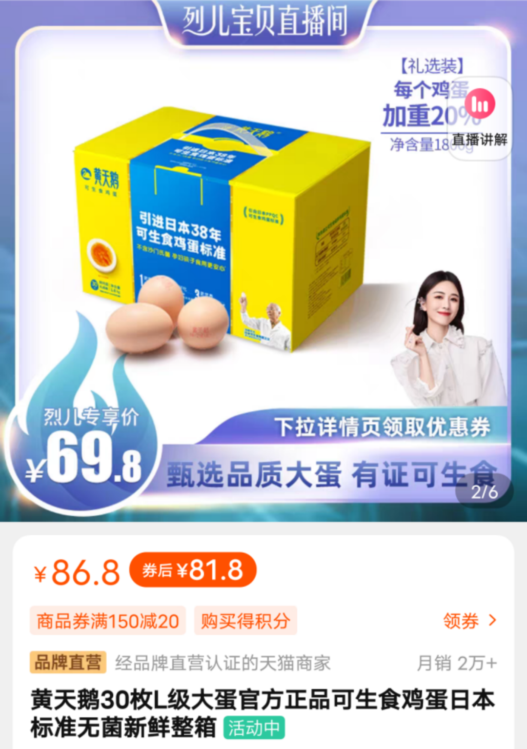 其销售价格也随之“水涨船高”。黄天鹅天猫旗舰店内销量第一的可生食鸡蛋售价为81.8元/箱(每箱30个),几乎是天猫超市销售的土鸡蛋价格的两倍。