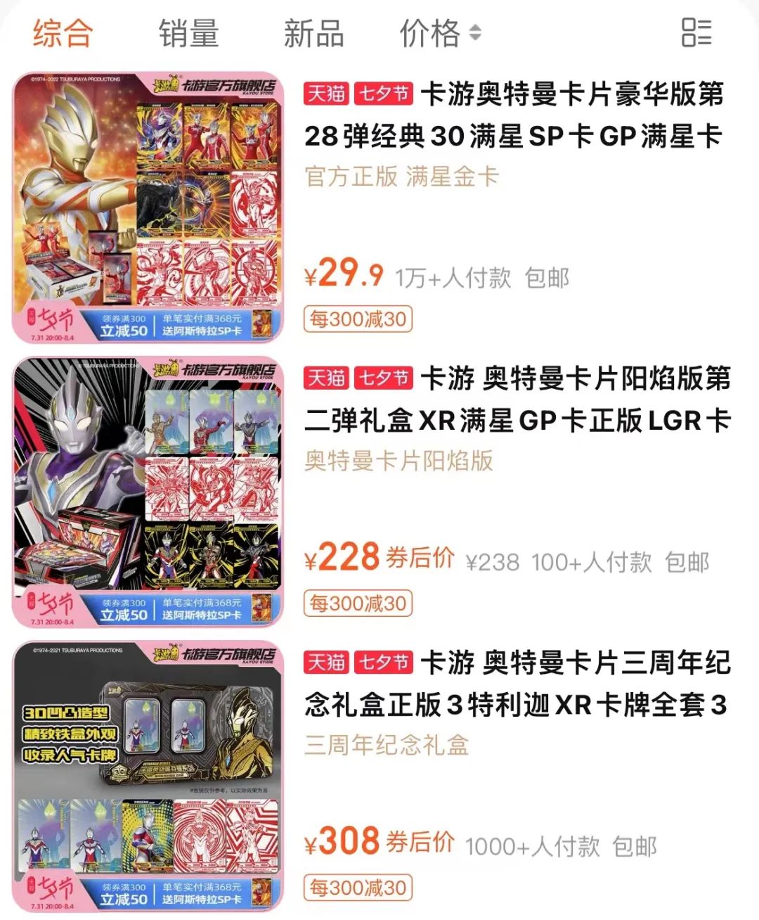 卡游旗舰店售卖的奥特曼卡牌最低售价为29.9元一套150张,最贵的三周年纪念礼盒装售价358元,包含高级别的XR卡两张,卡牌30张,补充包4包32张,卡砖1个,收藏册1本。
