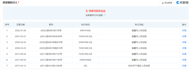 此三条被执行信息的执行法院均为诸暨市人民法院,案号为(2022)浙0681执5116号的相关案件执行标的为14738.96万元,案号(2022)浙0681执5117号的执行标的为17044.59万元,案号(2022)浙0681执5118号的执行标的为4613.59万元。