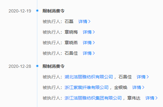 作为洁丽雅第一大股东,浙江洁丽雅毛巾有限公司也数次被执行。其中,因与广发银行股份有限公司杭州分行纠纷,浙江洁丽雅毛巾有限公司股东石磊、石昌佳曾被限制高消费。而石磊系洁丽雅第一大股东、董事长。