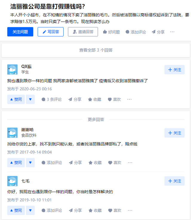 不止大型造假公司,小超市也在洁丽雅的维权范围内。知乎上有网友称,因自家小超市在不知情的情况下卖了洁丽雅的毛巾,被洁丽雅以商标侵权起诉到了法院。