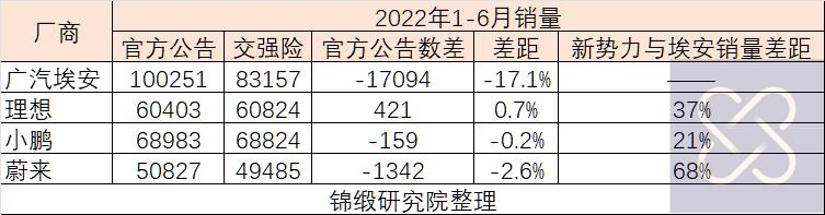 质疑一:埃安汽车的终端上险量与销量,存在不小的差距。比如上半年官方公告销量为10.03万辆,上险量为8.32万辆。两者之间的差距,其原因在于埃安的汽车销售模式和蔚小理等新势力有所不同。埃安目前仍归属于广汽的销售渠道,部分汽车是被经销商买走的,经销商在终端把车卖给消费者才能有上险。而蔚小理这边则是直营的模式,中间没有经销商,不会出现这种情况。而且,即使以上险量作为统计口径,广汽埃安的销量仍分别比蔚小理多68%、21%、37%。