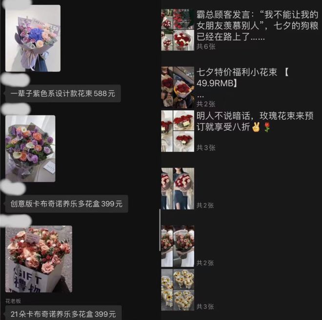 早在七夕前3-4天,燃次元所在的多个鲜花社群就已经开始了“七夕节花束”预定活动。多数是以传统玫瑰主打的花束,有低至49.9元的小花束,也有超800元的高级花束。