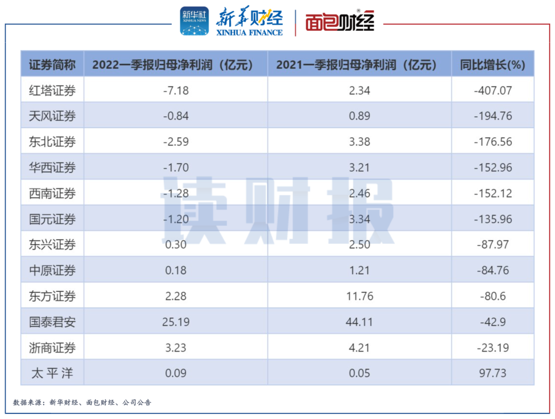 数据显示,2022年第一季度,除太平洋的净利润同比增加超九成外,其余11家上市券商归母净利润的同比降幅较大,普遍降幅在80%以上。