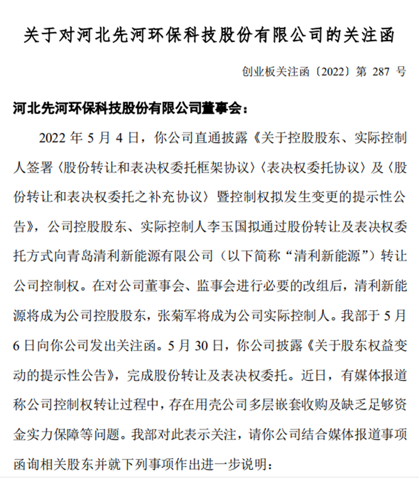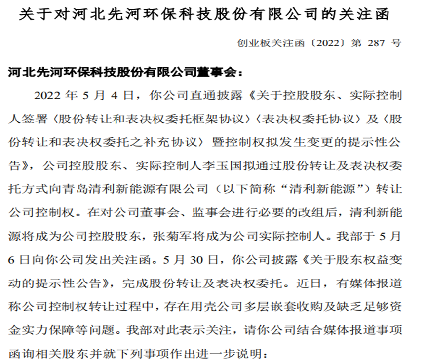 到目前为止,由于收购中存在的诸多谜团,先河环保已连收三封关注函。