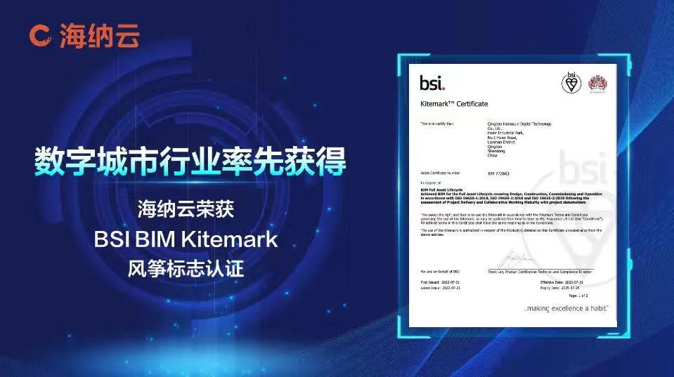 海纳云成立3年来,已获得专利/软著总数400余件,主编或参与国际、国家等标准40余项,荣获工信部颁发的“2021年物联网示范项目”、“2021年大数据产业发展试点示范项目”等多项国家层面、行业层面的认可。今年7月份,海纳云通过了BSI(英国标准协会)的严格审核,荣获BSI “BIM Kitemark风筝标志”认证,成为数字城市行业率先获得该认证的企业,标着着海纳云的BIM全生命周期产品达到了ISO19650 BIM信息管理的国际标准,得到国际认可。