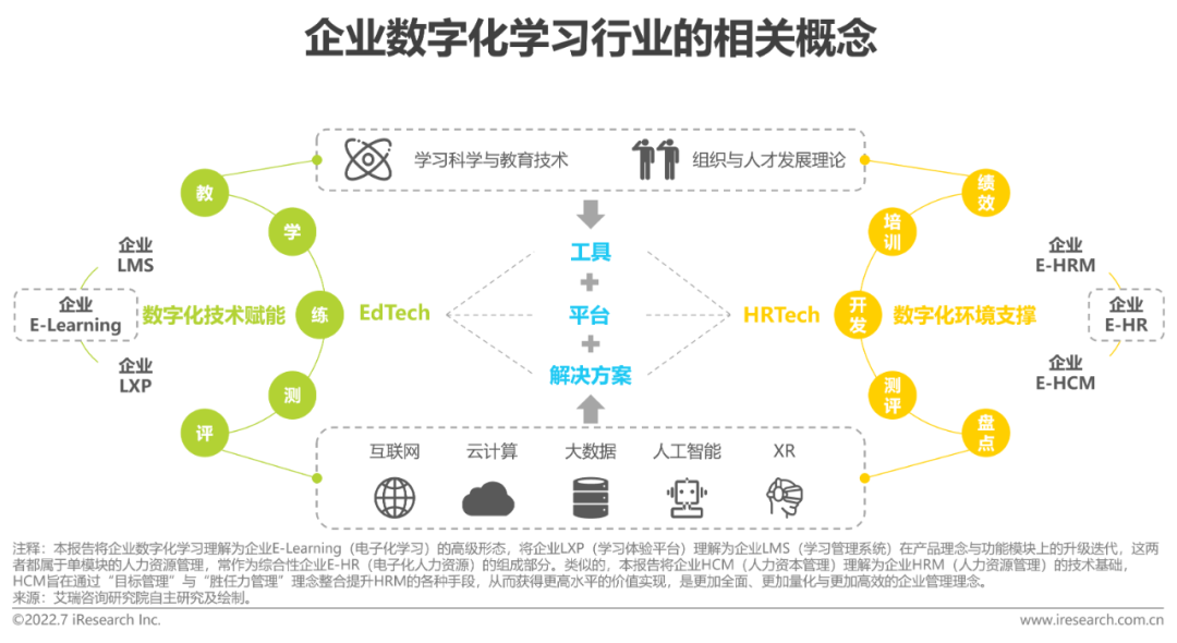 从人力资源科技(HRTech)的角度来看,企业数字化学习强调企业通过构建数字化技术支撑环境,对组织学习的目标、主体和过程施加影响,以实现企业培训开发与人才发展的数字化转型。基于此,本报告主要研究面向企业客户,提供学习与人才发展的数字化工具、平台和解决方案的供应商,这类厂商所构成的行业被称为“企业数字化学习行业”。