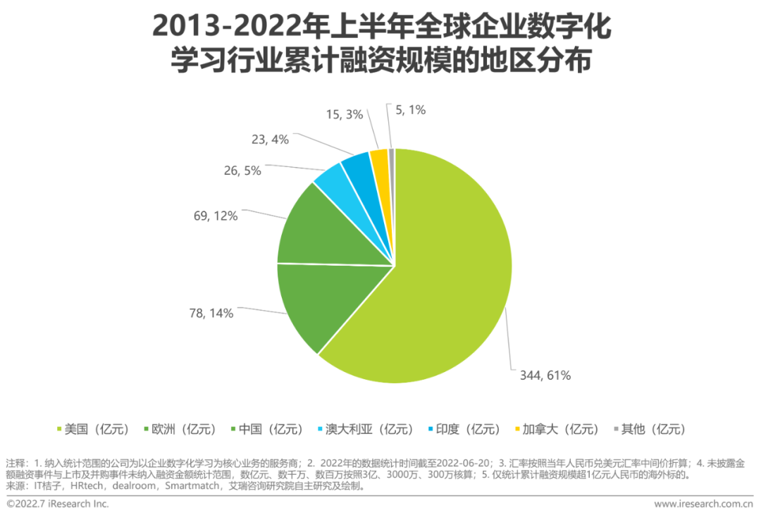 不可抗力对商业格局的冲击是影响资本流向的重要因素。首先,疫情利好之下,全球资本青睐企业数字化学习行业。据不完全统计,2020年疫情至今,行业累计融资额占近十年累计融资额的76%,2021年海内外市场融资规模均创历史新高。其次,头部厂商吸金能力显著。国内方面,近十年以来,约37%的资金流入云学堂;海外方面,深耕行业20年的Articulate更是顺势完成了首轮15亿美元的融资,成为全球一级市场融资规模最大的一笔交易(并购和IPO除外)。最后,“双减”重塑国内教育市场资本格局。因横跨“企业服务”与“职业教育”两大黄金赛道,顺应产业数字化升级的技术浪潮,行业融资规模在教育行业遭遇资本寒冬之际实现逆势增长,亿元级融资近10起,已成为教育行业热度最高细分赛道。