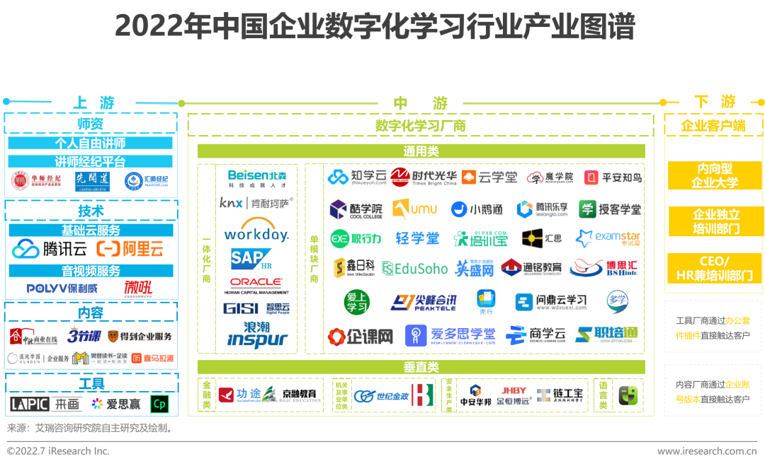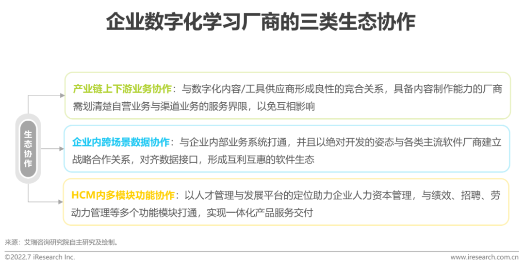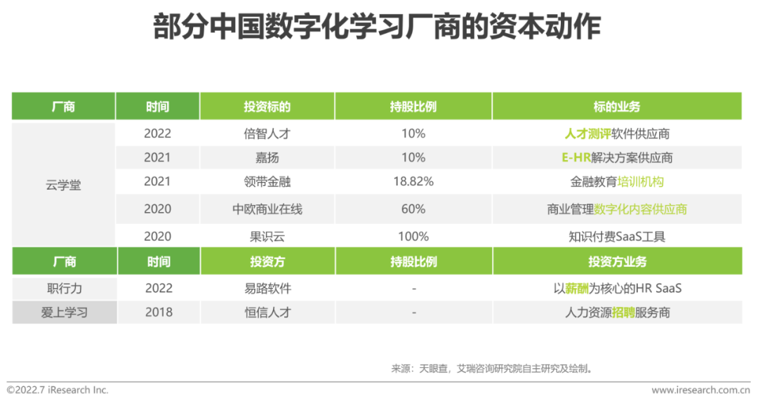 若要对未来进行展望,建立平台化的生态协作关系是提升厂商存续能力的保障,在这一过程中,资本有望成为加速关键资源流转效率的工具。对标欧美成熟市场,企业学习与人才发展始终存在着千丝万缕的关系。从并购视角来看,无论是CSOD收购Saba和Sumtotal,还是LTG(欧洲最大的企业数字化学习厂商)收购Peoplefluent(全球领先的人才管理软件厂商)、Breezy HR(中小企业人才招聘软件厂商) 和Reflektive(绩效管理软件厂商),数字化学习厂商最终都走向了HCM解决方案供应商。艾瑞认为,一方面,业务相关性能够充分发挥企业学习与人才发展的协同效应,另一方面,于增速逐渐放缓的成熟市场而言,更大的市场空间也将打破厂商的增长天花板。反观中国市场,随着企业数字化学习行业逐渐成熟,或将出现产业分工细化及并购整合频繁的景象。据不完全统计,近五年来,部分厂商围绕产业链上下游、企业内各业务场景及HCM内各功能模块进行了频繁的资本布局,行业走向一体化人才管理与发展平台的趋势已有雏形。