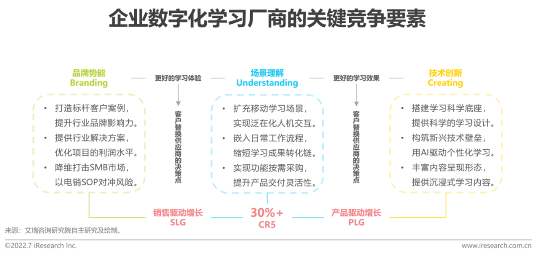 市场相对分散,头部品牌初显,CR5超过30%,各类厂商围绕品牌势能、场景理解与技术创新打造核心竞争力。首先,通过标杆客户案例提升品牌影响力仍是行业通行法则,“客户含五百强率”依旧是影响潜客心智的重要指标。在盈利性要求与规模化增长的压力之下,越来越多的厂商开始将客户案例凝练成灵活且可扩展的行业解决方案,提升产品及服务的标准化程度,优化项目边际利润。其次,移动学习与SaaS产品正悄然变革传统竞争格局,泛在化学习重构了传统企业学习的方式,基于移动端的学习需求激增,全新的人机交互形式、学习内容形态和知识应用场景倒逼基于PC端的E-Learning厂商自我迭代,部分新型厂商也顺势实现了弯道超车。此外,按需采购与灵活部署的SaaS产品正在以极高的性价比赢得更多客户的青睐,中大型客户的原生学习管理系统面临替换危机,中小型客户市场的价值正在被重新挖掘与定义。最后,学习科学与AI/VA/AR等新一代技术的融合创新正在为企业学习平台构筑技术壁垒,通过科学的学习设计、灵活的技术应用和全面的人才测评,提升学习的针对性和趣味性,通过激发员工强烈的学习意愿,驱动基于工作流的知识应用与行为改变。
