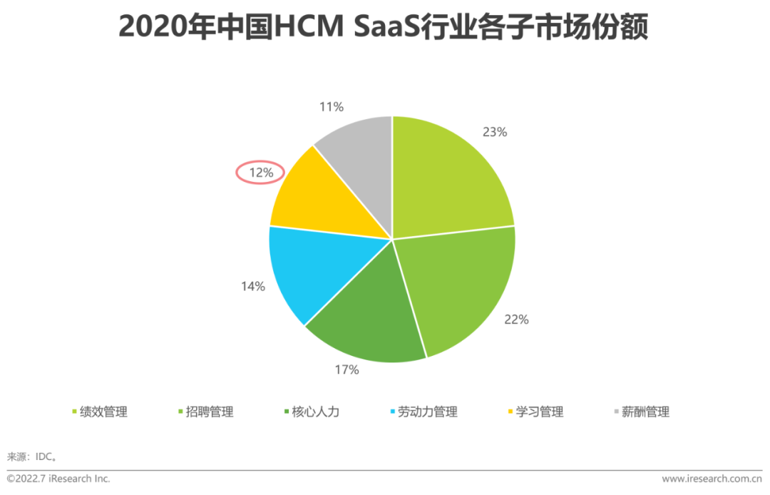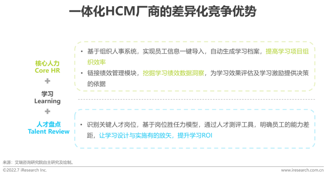 根据IDC的调研,中国HCM(人力资本管理)SaaS中与企业数字化学习相关的“学习管理”市场仅占12%(2020年),因人力资本管理领域各业务环节的关联性较大,未来将有越来越多的单一模块厂商向功能全面、高度集成和数据互联互通的一体化解决方案厂商发展,“学习管理”成为众多厂商完成端到端交付的必要组成部分,传统的学习管理系统(LMS)市场竞争加剧。值得注意的是,这类厂商的“学习管理”模块更类似于ERP子系统,侧重于企业学习的流程管理及标准化内容开发,是帮助企业实现降本增效的管理工具,并非真正意义上“以学习者为中心”,关注行为改变与绩效改进的学习产品。因此,以“数字化学习”作为组织与人才发展核心驱动力的一体化厂商才能对现有市场玩家构成真正的威胁。这类一体化厂商多主张关注员工学习体验,强化员工绩效支持,赋能业务关键环节,通过交付专业化的学习内容与落地系统性的运营活动,在众多人力资本管理软件中形成自己的特色,也构建了差异化的竞争优势。