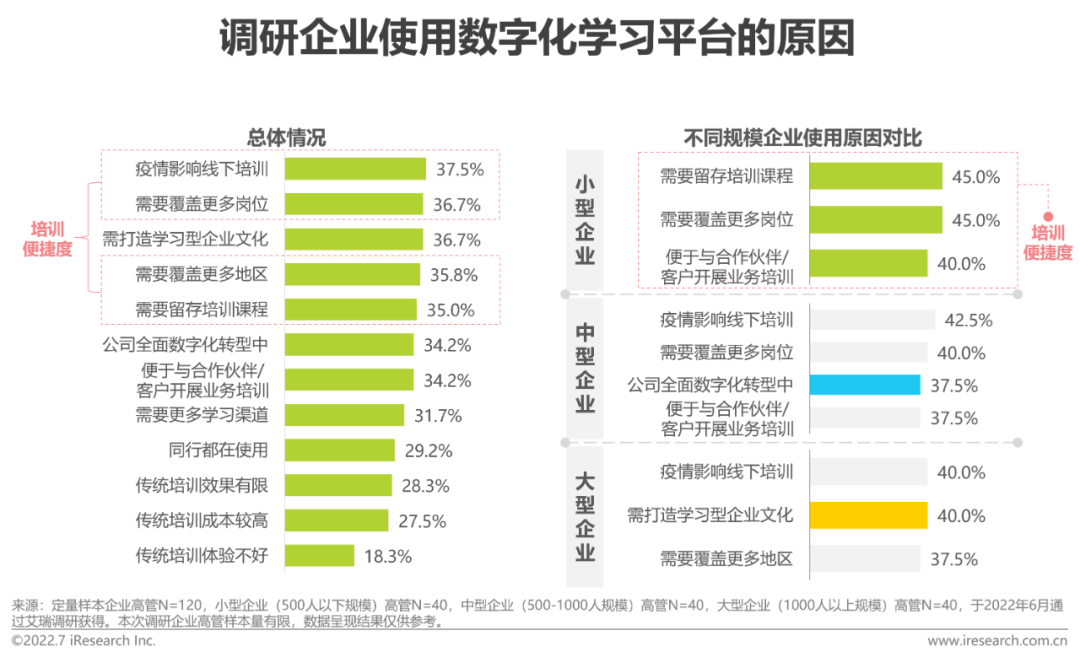 疫情之下,企业举办线下培训的难度加大。尤其对有多岗多地培训需求的企业,如何提升培训便捷度越发成为企业关心的痛点问题。分规模来看,中型企业对通过数字化学习平台提升公司数字化转型进程更加关注,而大型企业则更加关注数字化学习平台在打造学习型企业文化上的作用。
