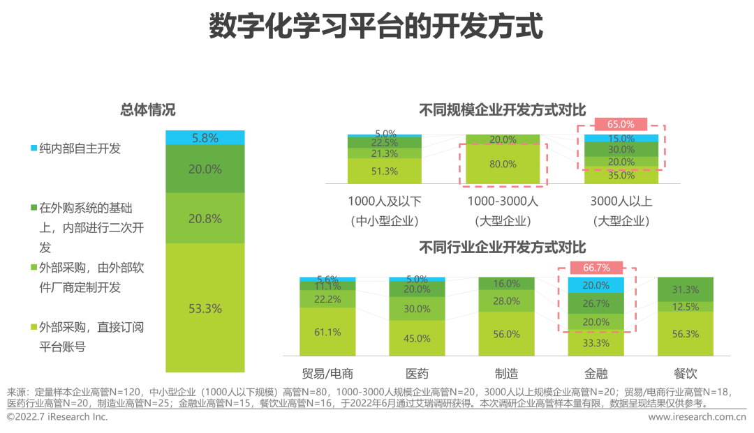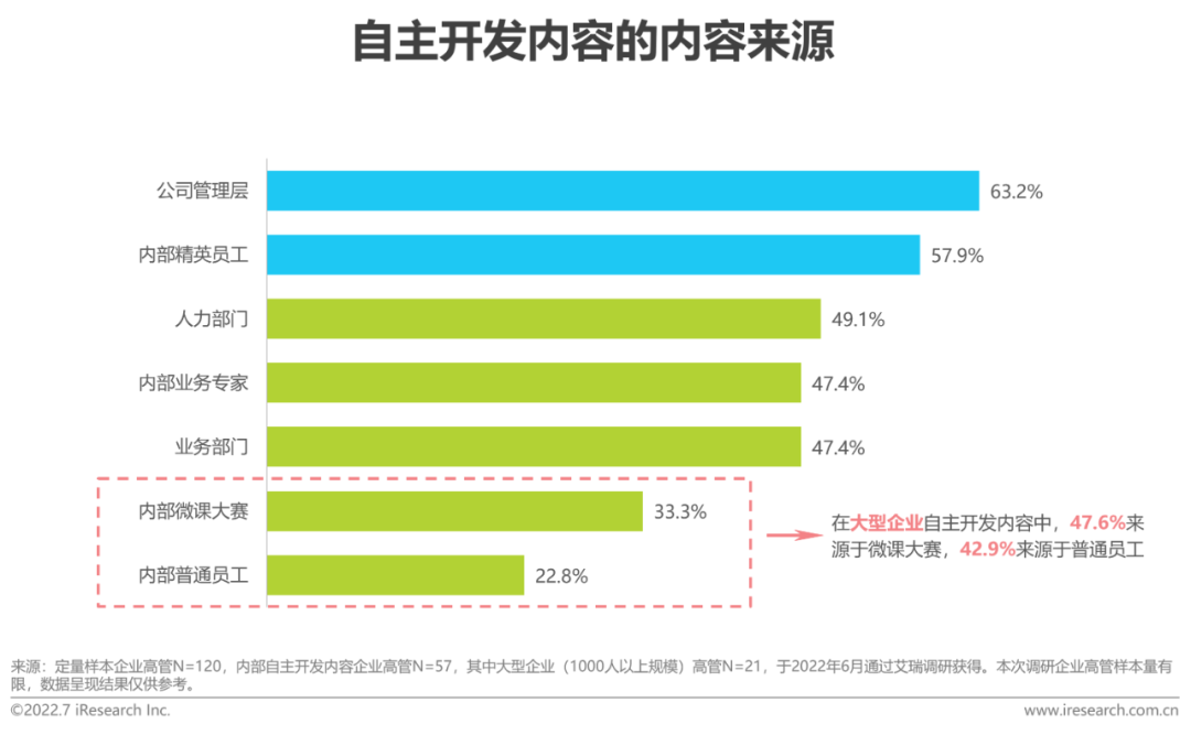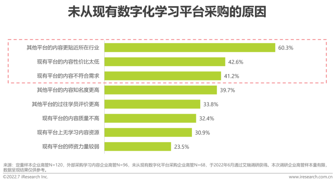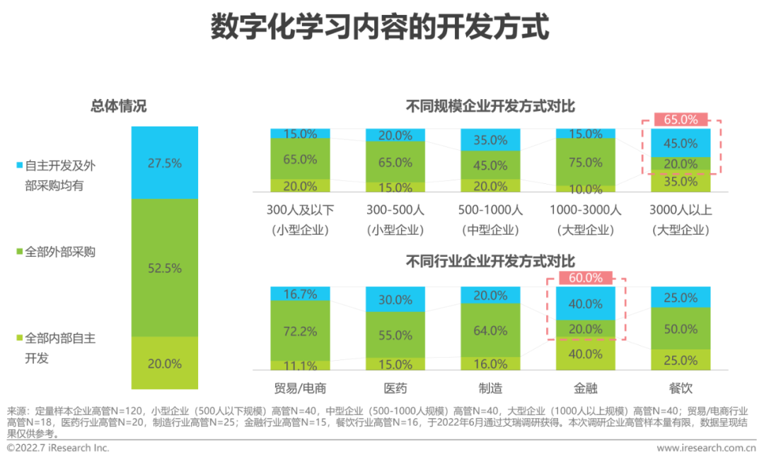 在企业客户对内容类型及形式的多样需求下,八成的调研企业会选择从外部采购数字化学习内容。与平台的开发方式类似的是,分规模来看, 相比3000人以上规模企业,3000人以下规模企业更多从外部采购内容,也是厂商可以考虑着重关注的规模类型;分行业来看,相比金融行业,贸易/电商、医药、制造及餐饮行业更多从外部采购内容,也是厂商可以考虑着重关注的行业。(由于各规模及行业样本量有限,本数据及推论仅代表本次调研数据现状,不能作为策略制定支撑数据,若需使用请做进一步结构化、足样本调研。)