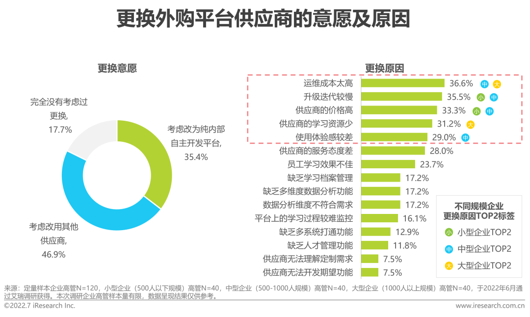 虽然大部分企业选择外购平台,但因为平台的运维成本较高、升级迭代较慢、价格较高、学习资源较少等原因,超八成外购系统的企业考虑更换现在的平台供应商。分规模来看,在考虑更换供应商时,大型企业认为现有平台运维成本太高且学习资源太少,中小型企业则较多考虑平台迭代速度和价格水平。因此,为大型企业客户链接更多资源、降低运维成本,为中小型企业客户减少不常用功能以降低采购成本、提高迭代速度是维系长期稳定客户关系的关键。