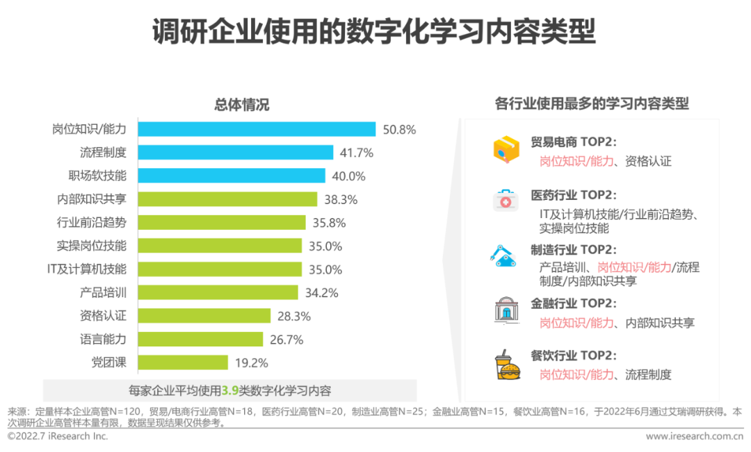 除了数字化学习平台上的各类功能外,课程、课件、教学游戏等各类数字化学习内容也是企业客户产生多样化需求的重要组成部分。根据调研,每家调研企业平均使用约4类学习内容,其中以岗位知识/能力类(50.8%)、流程制度类(41.7%)及职场软技能类(40.0%)为主。分行业来看,岗位知识/能力类内容是各行业均较多使用的类型,除此之外,其他使用较多的内容类型均有所不同。