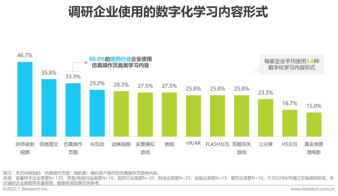 与多内容类型需求相近的是,每家调研企业平均使用3.6种内容形式,其中以讲师录制视频类(46.7%)、信息图文类(35.8%)、仿真操作页面类(33.3%)及AI互动类(29.2%)为主,而沉浸感更强的模拟游戏和VR/AR类资源相对较少。此外,60.0%的医药行业企业选择使用模拟客户操作的仿真操作页面类内容,这可能与医药行业有较多实操类学习内容需求有关。