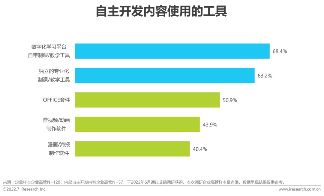根据调研,核心员工(如管理层及内部精英员工)是绝大多数企业自主开发内容的主要来源,而对于大型企业而言,自制内容也较多来源于普通员工和微课大赛。在内容开发工具的使用上,对于非专业的制课人员,简单易用的专业化制课/教学工具是企业的首选,其中,利用数字化学习平台内置的专业化工具进行课程开发是更加常见的自制课程开发形式。