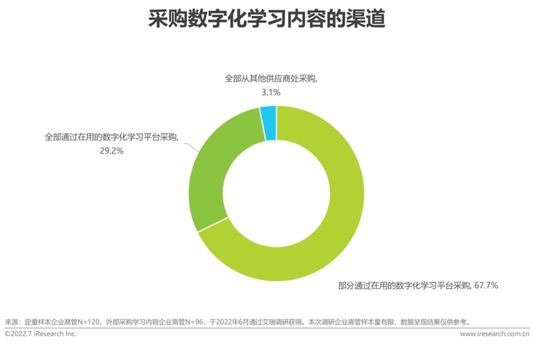 在采购渠道上,超九成的数字化学习内容是通过现有数字化学习平台采购,可见现有平台是企业直接触及各类内容资源的第一渠道。但其中仍有67.7%的调研企业通过其他平台采购部分内容,这主要是因为调研企业多认为现有平台内容不如其他平台贴近需求、内容性价比太低,根据前文数据调研结论,这一定程度上意味着,在企业不缺乏内容获取渠道时,渠道本身的价值将让位于内容的针对性和性价比,但上游数字化学习内容厂商和中游数字化学习平台厂商的最大利益点不尽相同,内容供应商关注的是标准化与规模化,而平台厂商关注的是客户成功及续费,从客户一站式采购体验的角度出发,具备内容制作能力的平台厂商,可基于平台上沉淀的学习数据和客户反馈,进行针对性的内容开发。