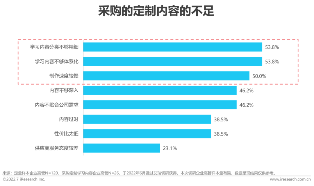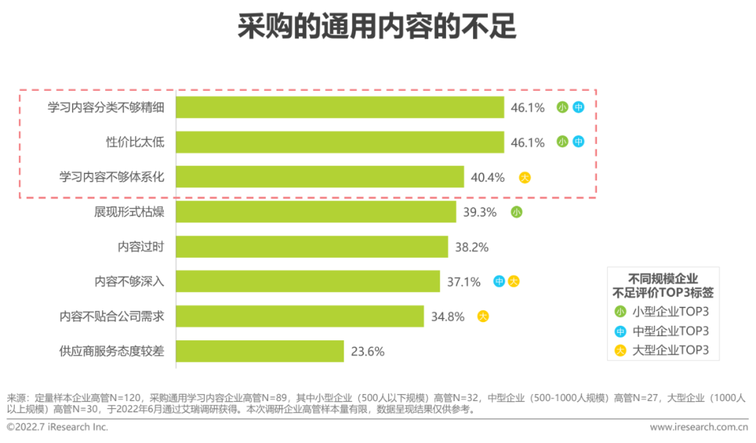 在企业客户对采购内容质量的高要求下,通用内容及定制内容客户均多认为采购内容分类不够精细、内容不够体系化。因此对内容进行精细化、体系化梳理,是进一步满足客户需求的重点。同时,相比定制内容客户,有较多的通用内容客户(46.1%)认为学习内容性价比太低,这可能是因为通用内容客户较为脱离制课环节,课程内容难以与企业自身的业务实际相结合,导致高价内容的学习效果仍不及预期。分规模来看,越大规模企业对通用内容体系化、深入度要求更高,因此针对小型企业,需要进一步提升通用内容的表现形式,而针对大型企业,则要加大对通用内容开发的深入程度。