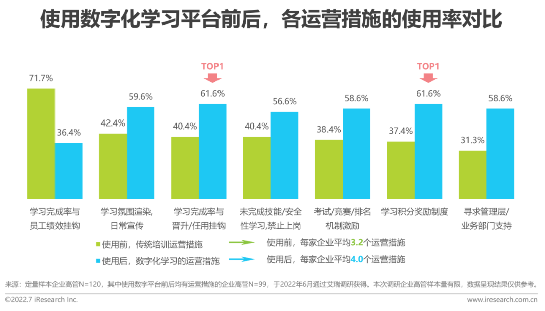 企业内部对学习培训的运营/推广是让企业学习顺利落地实施的保障,根据调研,在使用数字化学习平台前,71.7%的调研企业依靠学习完成率与员工绩效挂钩的方式推动员工参与传统学习,而仅四成企业选择使用其他措施;但在使用后,每家企业的平均运营措施由使用前的3.2个升至4.0个,其中约六成的企业转向使用学习完成率与晋升/任用挂钩、学习积分奖励制度等方式。可见,使用数字化学习平台后企业客户的运营手段更加多样化,可能是因为相比于传统培训,数字化学习平台具有更便捷的管理手段、更多的数据分析维度,赋予了企业客户多样化推广学习的能力。